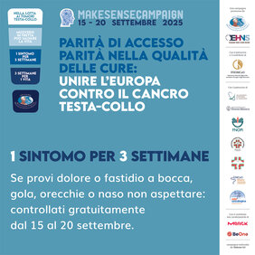 Con il motto “1 sintomo per 3 settimane, 3 settimane per 1 vita”, la Make Sense Campaign rinnova il suo impegno per sensibilizzare l’opinione pubblica su una forma tumorale, quella dei tumori cervico-cefalici, spesso sottovalutata ma che rappresenta il settimo tumore più diffuso in Europa. Uno degli aspetti più critici dei tumori del distretto testa-collo è la difficoltà di diagnosi. Si tratta di tumori che si manifestano con sintomi comuni, facilmente confondibili con disturbi stagionali o trascurabili. Ma esiste un modo per arginarli tenendo a mente la regola “1x3”: se anche 1 solo dei sintomi potenzialmente collegati ai tumori del testa-collo persiste per 3 settimane o più, è fondamentale consultare il medico, in quanto una diagnosi precoce può salvare la vita. Nei pazienti in cui il tumore viene individuato nelle fasi iniziali, il tasso di sopravvivenza supera infatti, in certi casi, l’80-90%. I sintomi da non ignorare includono: dolore alla lingua, ulcere che non guariscono, macchie rosse o bianche in bocca, mal di gola e raucedine persistente, difficoltà o dolore durante la deglutizione, gonfiore del collo, ostruzione nasale da un solo lato o perdite di sangue dal naso. Nessun allarmismo, però: una sana alimentazione e uno stile di vita attivo sono fattori importanti per la prevenzione primaria, e, se si tiene bene in mente la regola 1 x 3, è davvero possibile riconoscere in tempo la malattia e curarla. In caso di dubbi, non bisogna essere timorosi di parlarne con il proprio medico o con uno specialista otorinolaringoiatra o chirurgo maxillo-facciale.